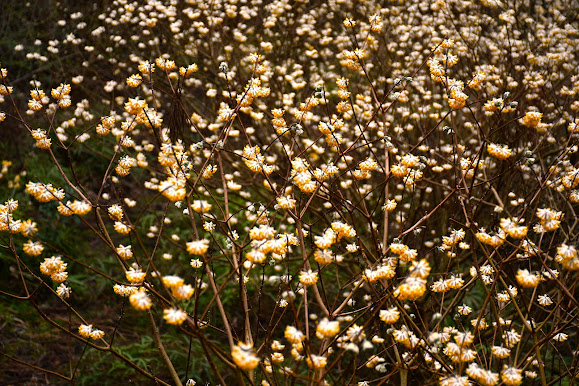 同じく美杉町のミツマタ。ここも薄暗い山の中に黄色い絨毯が広がったような光景に圧倒される。まるでミツマタの山である。これだけの広さを管理する地域の方々の苦労がしのばれる。本来は和紙の原料だが、香しい香りを放つこの花の光景もまた、この地域の宝だ。